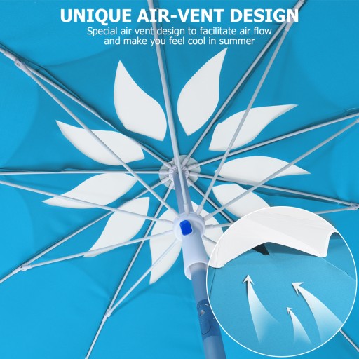 Nasz parasol plażowy o długości 6,5 stopy w paski jest idealny do podróży na plażę lub nad morze, a jego doskonała konstrukcja blokuje promienie ultrafioletowe ze wszystkich kierunków. Posiada srebrną powłokę zapewniającą ochronę przeciwsłoneczną UPF 50 , która pomaga blokować szkodliwe promieniowanie. Otwór wentylacyjny umieszczony na parasolu zwiększa jego odporność na wiatr i zapewnia większą stabilność parasola w wietrznych warunkach. Taki wygodny i lekki parasol będzie najlepszym wyborem podczas aktywności na świeżym powietrzu.