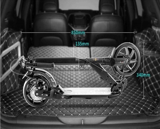 Duża i wytrzymała hulajnoga 2-kołowa z hamulcem tarczowym i amortyzatorami przeznaczona dla dzieci jak i dorosłych.