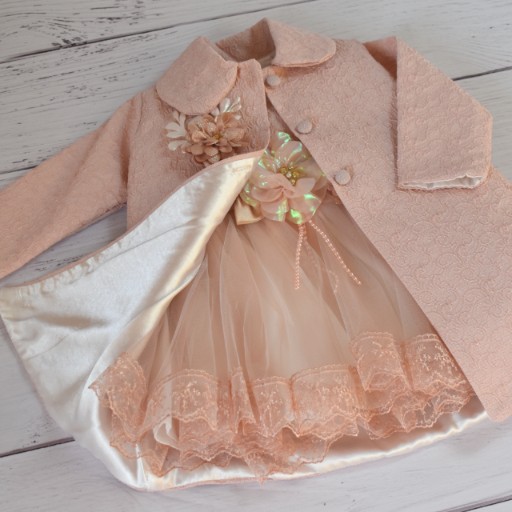 Ekskluzywny komplet - sukienka z idealnie podobnym płaszczem w różowym kolorze dla malej księżniczki.