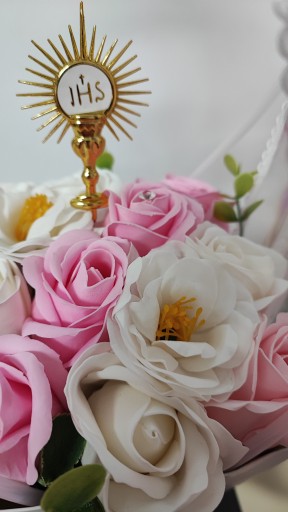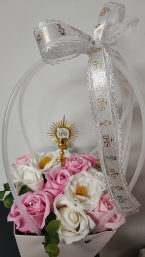 Ozdobne pudełko w kształcie koszyczka w kolorze białym wypełnione różami to znakomity prezent dla młodych w dzień tak wzniosłym jak Pierwsza komunia św. ...który sprawi obdarowanej osobie mnóstwo pachnącej radości...