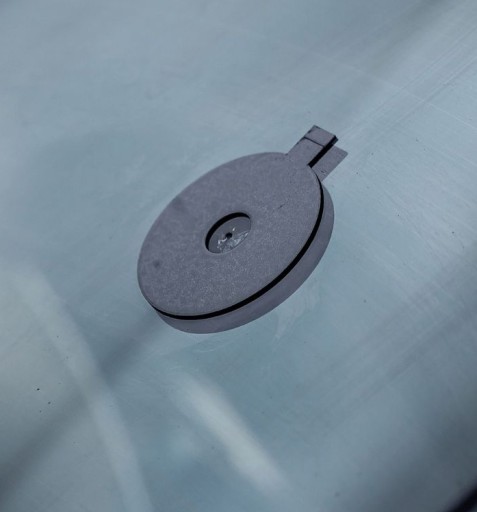2. Naklej uszczelkę samoprzylepną na szybę w miejscu odprysku. W tym celu odklej folię zabezpieczającą z jednej strony uszczelki. Naklej uszczelkę tak, aby odprysk był w środku otworu, a języczek skierowany był w górę. Dobrze dociśnij uszczelkę do szyby.