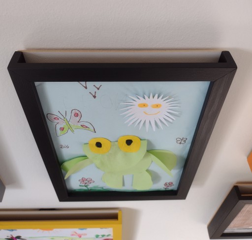 - Proste wkładanie i wyjmowanie prac. Wystarczy wsunąć rysunek od góry. Ramki nie trzeba zdejmować, otwierać każde dziecko poradzi sobie samo.