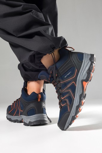 Granatowe buty trekkingowe damskie model B2115-5 zostały wykonane z wysokogatunkowych materiałów co gwarantuje doskonałą jakość i dopasowanie do stopy. Obuwie typu softshell to lekkie, wygodne buty sportowe z nowoczesnych i trwałych materiałów. Niezastąpione na spacer, do biegania lub na wyprawy górskie. To obuwie idealne dla aktywnych kobiet, lubiących spędzać czas na łonie natury, jak również miłośniczek górskich wycieczek. Cholewka wykonana jest z oddychającego materiału softshell, który ma również właściwości wodoodporne. Wnętrze obuwia w okolicach pięty i kostki jest wypełnione miękką pianką, a podszewka z siatki poprawia wentylacje i higienę stóp. Gumowa trwała podeszwa jest lekka, elastyczna i antypoślizgowa. Amortyzujące właściwości buta pomagają zachować stabilność, przyczepność oraz wysoki komfort podczas intensywnego użytkowania. Świetnie sprawdzą się podczas górskich wypraw jak i leśnych wędrówek. Posiadają wysoką cholewkę za kostkę. Pomarańczowe dodatki to idealny sposób, aby dodać obuwiu subtelności i szczypty uroku. Wytrzymała konstrukcja czyni ten model butem wielosezonowym, sprawdzającym się o każdej porze roku.