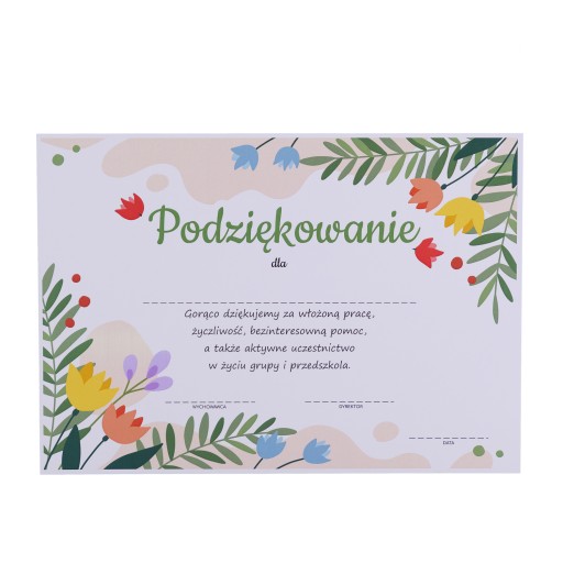 Dyplom z podziękowaniami dla rodziców dzieci w przedszkolu idealnie sprawdzi się jako upominek w ramach wdzięczności.