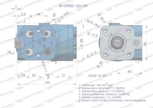 Hydrostatyczny zawór skrętu W-ORBS-OR 160 cm3/obr z zaworami (System Open Center - z reakcją z kół na kierownicę) Waryński. Orbitrole serii W-ORBS (OR) mają zwartą i solidną konstrukcję, pozwalającą na lekką i płynną pracę układu kierowniczego. Zasada działania systemu OPEN CENTER REACTION - popularny między innymi w ciągnikach sadowniczych poruszających się w trudnym do jazdy terenie. Kierowca/operator ciągnika przejeżdżając między pryzmami czuje przenoszenie drgań na swojej kierownicy. Dzięku temu ma czas na korektę toru jazdy, co daje jednocześnie możliwość nieuszkodzenia upraw. W tym układzie olej cały czas krąży i swobodnie przechodzi przez orbitrol, linię powrotną i przelewa się do zbiornika (pompa jest odciążona kiedy kierownica nie jest używana). Wszelkiego rodzaju naciski na koła spowodowane poruszaniem się po trudnym i nierównym terenie są przenoszone właśnie na kierownicę. Wspomaganie hydrauliczne gwarantuje wysoką precyzję kierowania sprzętem przy zachowaniu niewielkiej awaryjności.