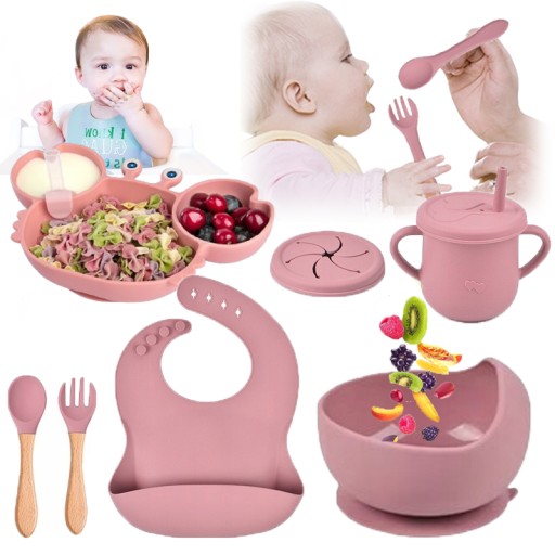 ⭐9 SZT SILIKONOWY ZESTAW NACZYŃ DLA DZIECI I NIEMOWLĄT Z PRZYSSAWKĄ KRAB RÓŻOWY⭐
