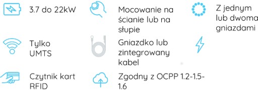 - Zintegrowany czytnik kart RFID, modem UMTS, oraz licznik energii w celu łatwej kontroli dostępu, rozliczania sesji ładowania, zdalnego zarządzania i aktualizacji oprogramowania.