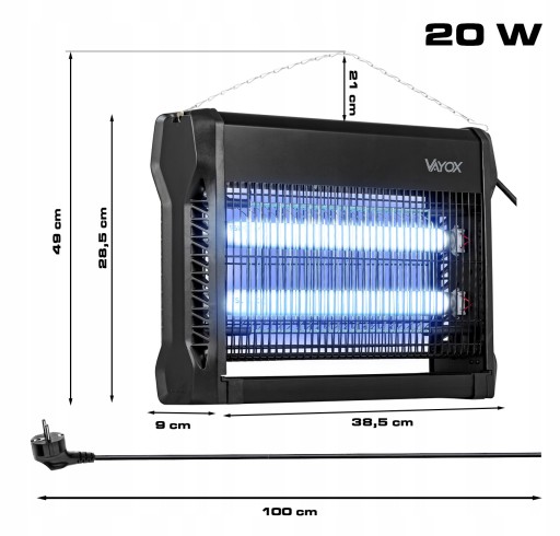 - W zestawie: 2 x świetlówki 10W UV, łańcuszek do powieszenia lampy, wyjmowana tacka na owady