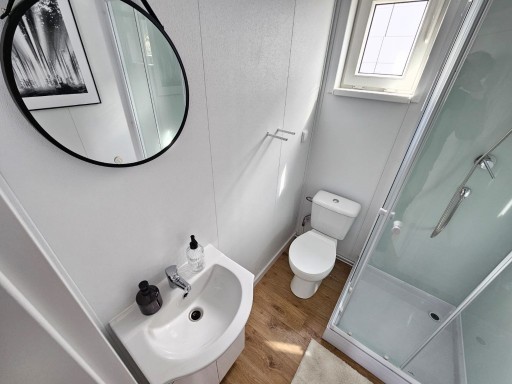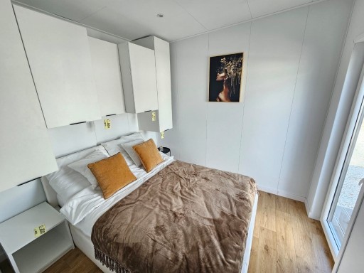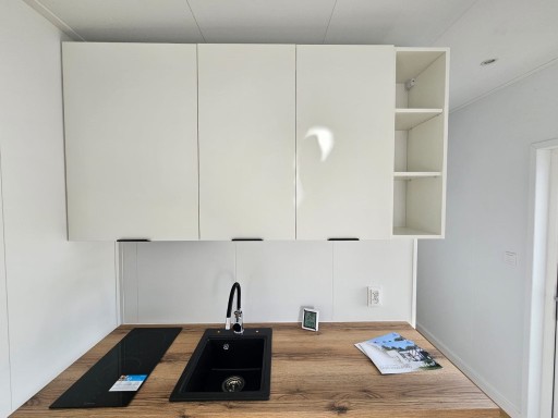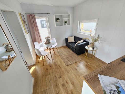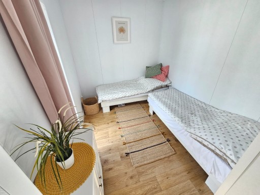 Dom modułowy całoroczny o całkowitej powierzchni 45mkw składający się z 2 modułów każdy z nich posiada swoje koła, okna i drzwi podwójnie przeszklone, oświetlenie Led, kuchnia z jadalnią, zlewozmywak, płyta indukcyjna dwupalnikowa, okap, szafki i szuflady z automatycznym do mykiem, łazienka z prysznicem i toaletą, 2 sypialnie z bezpośrednim wyjściem na taras, możliwość dołączenia kolejnego modułu do dużej sypialni wraz z tarasem.