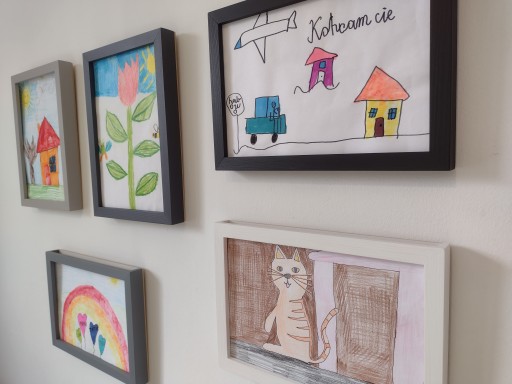 - Proste wkładanie i wyjmowanie prac. Wystarczy wsunąć rysunek od góry. Ramki nie trzeba zdejmować, otwierać każde dziecko poradzi sobie samo.