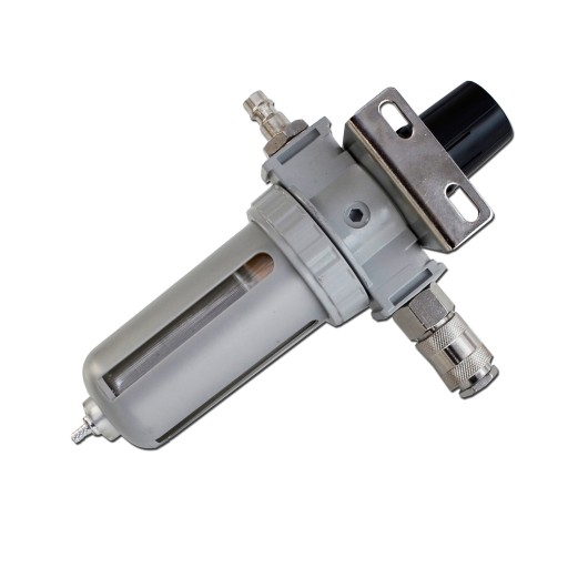 Filtr z reduktorem służy do osuszania i regulacji ciśnienia powietrza. Jest niezbędnym elementem każdej instalacji pneumatycznej. Stosując ten filtr zapobiegasz między innymi; rdzewieniu narzędzi, zaciekom podczas malowania pistoletami lakierniczymi, uszkodzeniom węży itp. Filtr nie wymaga dodatkowych mocowań, utrzymuje się na nyplu lub złączce, którą będzie przymocowany do kompresora.
