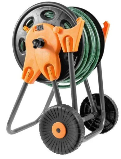 Bęben wykonany jest z mocnego polipropylenowego tworzywa odpornego na promieniowanie UV. Dużym atutem naszych wózków jest długa metalowa rączka, która ułatwia poruszanie się (bez schylania) oraz możliwość składania. Umożliwia to zaoszczędzenie miejsca podczas przechowywania. Metalowe rurki zabezpieczone są powłoką antykorozyjną. Obrotowe podłączenie przyłącza zapobiega skręcaniu się węża podłączeniowego przy rozwijaniu i zwijaniu węża zasadniczego. Wygodna korba. Duże, lekko kręcące się koła ze specjalnym profilem zapobiegającym ślizganiu się. Dostępny w kolorze czarno-pomarańczowym.