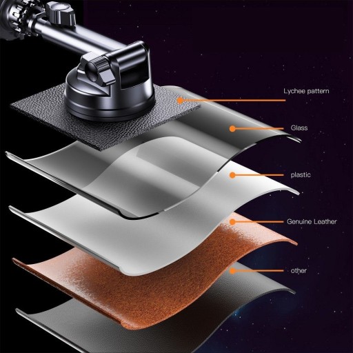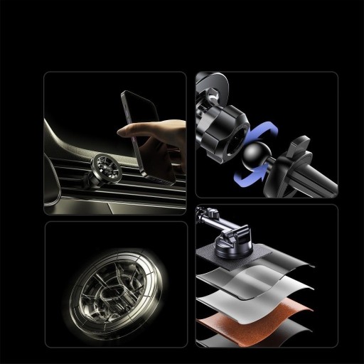 Uchwyt jest uniwersalny i pasuje do wielu różnych powierzchni – zestaw składa się z części, które umożliwiają zamocowanie uchwytu zarówno na szybie lub desce rozdzielczej, jak i na kratce wentylacyjnej.