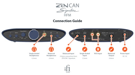 ZEN CAN Signature HFM oferuje wejścia stereo RCA i 3.5mm single-ended, plus zbalansowane 4.4mm wejście Pentaconn. Istnieje również wyjście zbalansowane 4.4 mm, dzięki czemu można podłączyć do wzmacniaczy mocy wyposażonych w zbalansowane wejście.