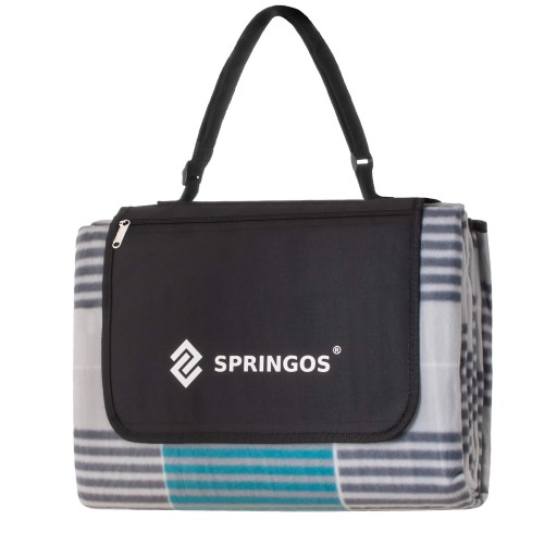 Koc marki Springos składa się do niewielkiej rozmiaru torby zapinanej na rzep. Dzięki temu nie trzeba się martwić o przestrzeń potrzebną do przechowywania. Dodatkowo posiada regulowany uchwyt, która pozwoli na zwinne przeniesienie koca na ramieniu z auta na plażę, czy z domu do ogródka, aby korzystać z pięknej pogody na wygodnym podłożu. Ponadto wyposażony został w kieszonkę zamykaną na zamek błyskawiczny w której można schować przekąski, telefon, czy małą książkę.