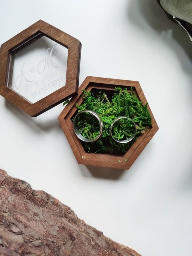 Nasze subtelne pudełko w kształcie heksagonu pozwoli w efektowny sposób podać obrączki na ceremonii ślubnej, doskonale sprawdzi się również jako dodatek do sesji przedślubnej. Jego naturalny charakter pozwoli z pewnością uzyskać piękne, fotograficzne pamiątki z ceremonii zaślubin.