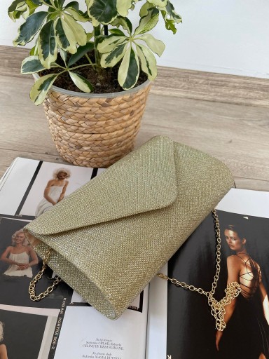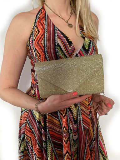 Efektowna torebka wykonana z błyszczącego, brokatowego materiału. Klasyczna i elegancka. Posiada dopinany, złoty łańcuszek.