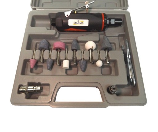 Mini szlifierka pneumatyczna Kit 1/4" model AT7032BK + 8 sztuk frezów HM pilników obrotowych marki Magma.
