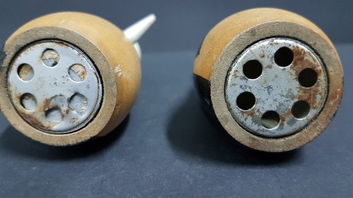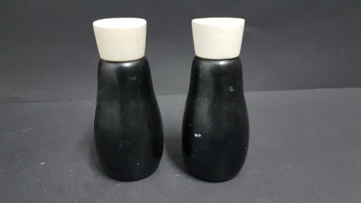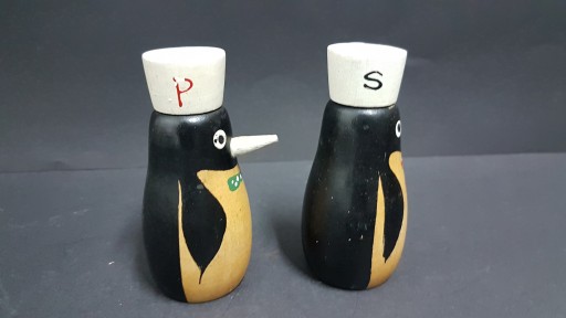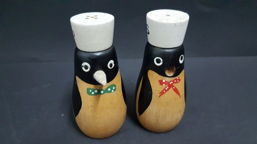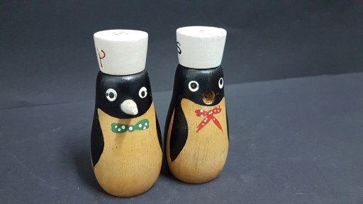 Stara solniczka i pieprzniczka, drewniane pingwiny. Jeden z pingwinków nie posiada dzioba.