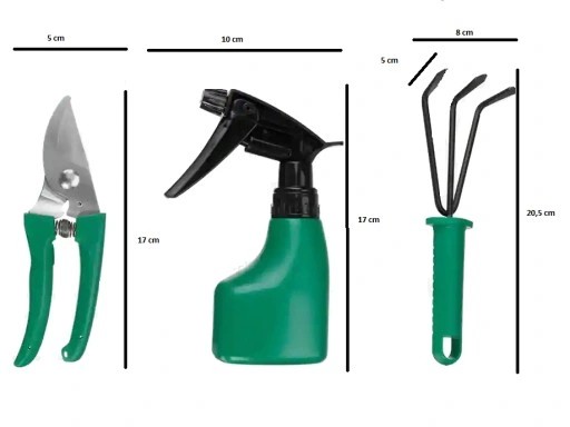 1. Łopatka doniczkowa szeroka2. Łopatka doniczkowa wąska3. Pazurki4. Sekatorek5. SpryskiwaczPodstawowy przydatny zestaw dla ogrodnika i działkowca. Doskonały pomysł na prezent.