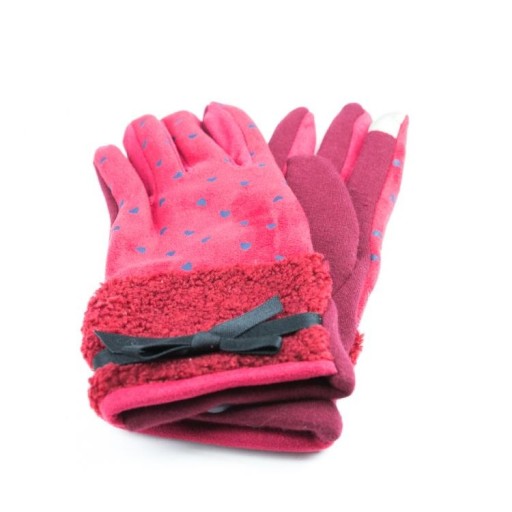 Urocze, ciepłe rękawiczki w serduszka, zdobione kokardką. Idealne na zimę!Do wyboru w różnych kolorach.Prawa rękawiczka posiada na wskazującym palcu specjalną nakładkę umożliwiającą używanie telefonów dotykowych.Nadadzą każdej zimowej stylizacji wyjątkowego charakteru.Skład: 30% wełna70% akryl