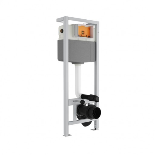 Stelaż jest prosty w montażu, posiada tylko 4 punkty mocowania. Dzięki odpowiedniemu zaprojektowaniu zbiornika, możliwe jest podłączenie wody w dwóch miejscach z lewej strony oraz z góry. Do przyłączenia wody zastosowano wytrzymałe mosiężne przyłącze. Zestaw posiada także mosiężny zawór odcinający.