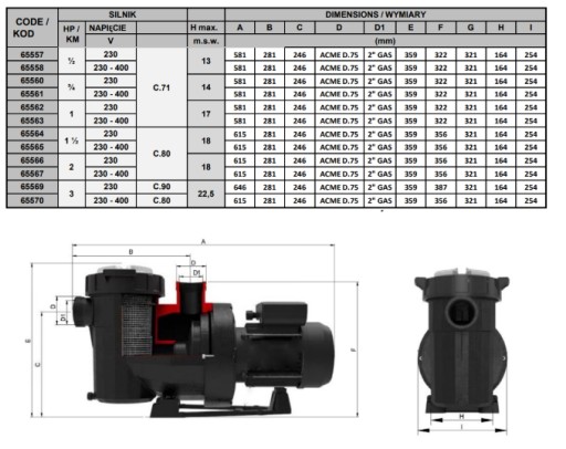 Moc 0,5HP 430W- zasilanie 230V z jednej fazy.