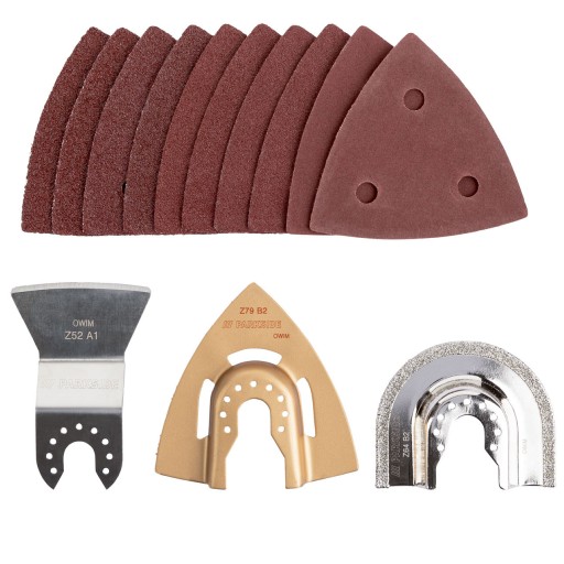 Zestaw akcesoriów do urządzenia wielofunkcyjnego Parkside PMFWZA 1 A1. Zawiera wszystkie akcesoria jak na zdjęciach.