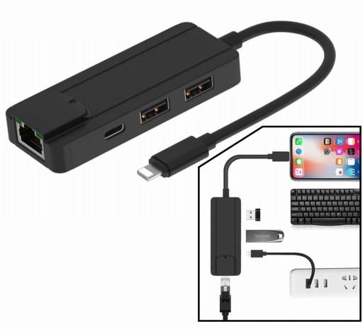 - HUB z wtyczki lightning do 2 x USB 2.0 i RJ45