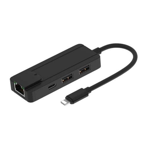 HUB z wtyczką lightning do podłączenia z produktami iPhone i iPad. Świetnie sprawdzi się z urządzeniami mobilnymi podczas zabawy i pracy. Do gniazd USB 2.0 można podłączyć zestaw do pisania - klawiaturę bezprzewodową i myszkę, dysk zewnętrzny oraz inne akcesoria. Za pomocą modemu ethernet 10/100 mb/s, możliwe jest posługiwanie się internetem bez zasięgu WiFi oraz sieci GSM. Niezakłócony internet zadziała po podłączeniu kabla z wtyczką RJ45. Za zasilanie urządzeń peryferyjnych odpowiada dodatkowe gniazdo lightning. Plug&Play - wystarczy podłączyć. Nie obsługuje urządzeń powyżej 200mA.
