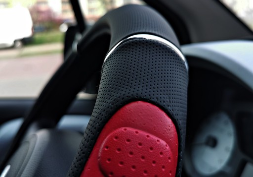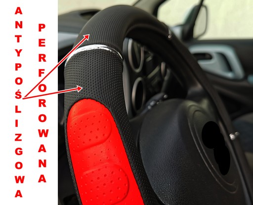 Pokrowiec na kierownicę czarno czerwony wykonany z wysokiej jakości ekoskóry perforowanej z wykończeniem chromu.