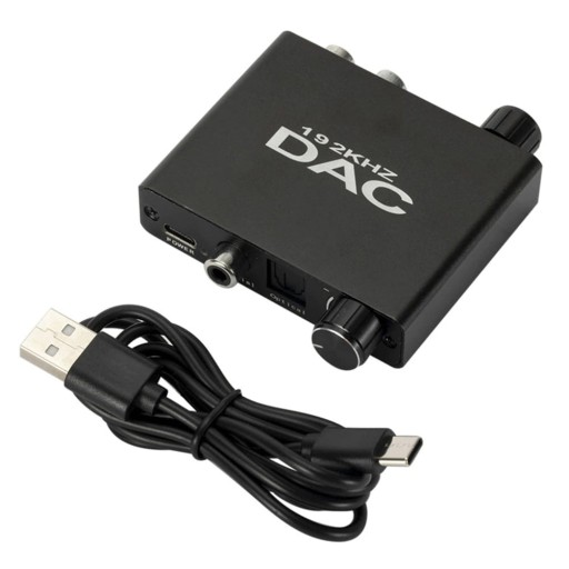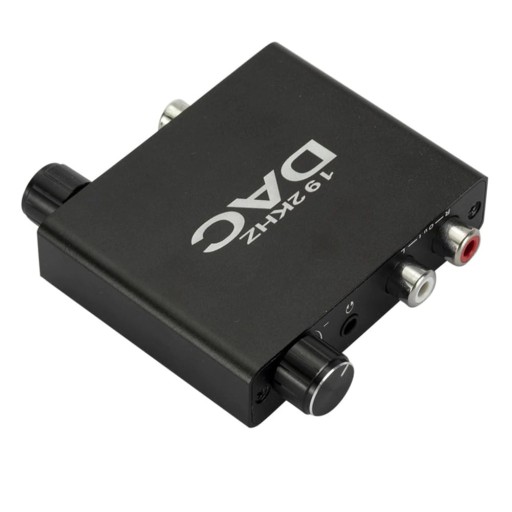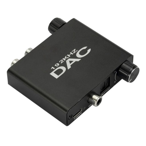 DAC 192KHZ jest urządzeniem, które konwertuje sygnał audio z cyfrowego na analogowy. Konwerter umożliwia konwersję sygnału z cyfrowego złącza Toslink lub coaxial na analogowe 2x Cinch lub JACK. Urządzenie wyposażone zostało w reduktor szumu, dzięki czemu jakość dźwięku jest jeszcze lepsza. Współpracuje ze słuchawkami pracującymi w zakresie 32 ~ 600Ω. Wyposażony w dwa pokrętła, do regulacji basów oraz regulacji głośności.