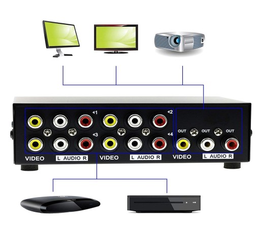 Do Switcha za pomocą kabli Chinch podłączamy 4 różne urządzenia - przykładowo 4 dekodery do złącz oznaczonych "Video oraz audio 1, 2, 3, 4", a ze złącz ozaczonych "OUT" prowadzimy przewód AV do monitora/telewizora. Za pomocą przycisków na urządzeniu wybieramy, który obraz ma być wyświetlany.