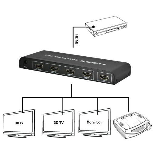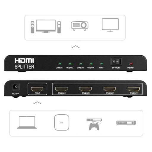 - Kierunek: z 1x HDMI na 4x HDMI (klonowanie obrazu na cztery odbiorniki z jednego wyjścia)