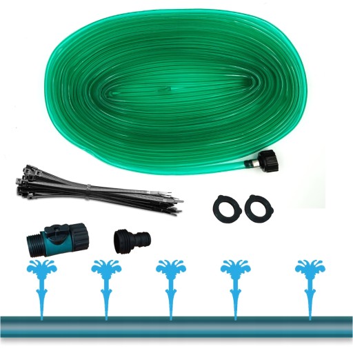 W zestawie do tunelu otrzymują Państwo linię kroplującą o długości 12m. Wąż na całej swojej długości posiada małe otwory, które odpowiadają za zraszanie, a zakończony jest uniwersalnym nyplem.