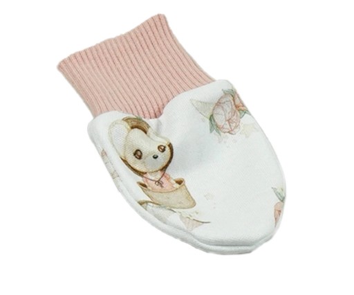 Miękkie łapki chronią buzię maluszka przed zadrapaniem, podczas wykonywania nieskoordynowanych ruchów w pierwszych tygodniach życia dziecka.