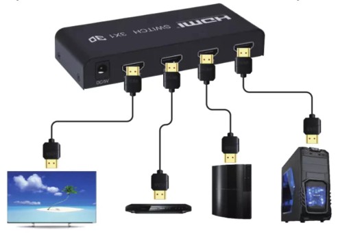 Switch HDMI umożliwia podłączenie 3 urządzeń do telewizora który ma tylko jedno wejście HDMI np dekodera / odtwarzacza VHS / odtwarzacza DVD. Za pomocą przycisku na urządzeniu lub za pomocą pilota, przełącza się pomiędzy trzema urządzeniami i wybiera te, które ma być aktualnie wyświetlane.