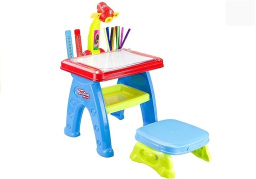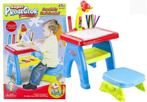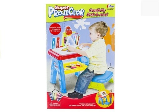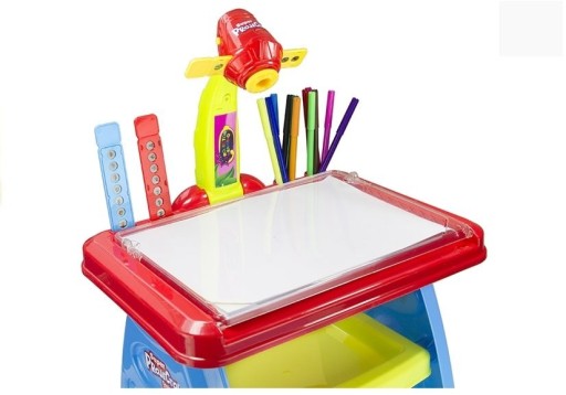 Wielokolorowe biurko z rzutnikiem będzie spełnieniem marzeń każdego dziecka. Na stoliku można wyświetlać slajdy zarówno na płasko, jak i na ścianie. Zestaw z projektorem jest doskonałym narzędziem do nauki rysowania oraz odwzorowywania wybranych obrazków.