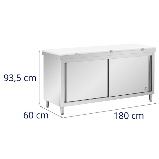 Powierzchnia robocza szafki ze stali nierdzewnej o wymiarach 180 x 60 cm zapewnia miejsce na codzienną pracę ze świeżą żywnością, składnikami i sprzętem kuchennym. Pomysłowe połączenie deski do krojenia MDF o grubości 30 mm z wytrzymałą uszczelką z tworzywa sztucznego i szafką do przechowywania pozwala na szerokie zastosowanie i utrzymanie porządku w kuchni. Wyposażona w dwoje praktycznych i zajmujących mało miejsca drzwi przesuwnych, szafka robocza szczególnie polecana jest do małych kuchni. Naczynia przechowywane wewnątrz pozostają bezpieczne i czyste za gładko chodzącymi drzwiami.