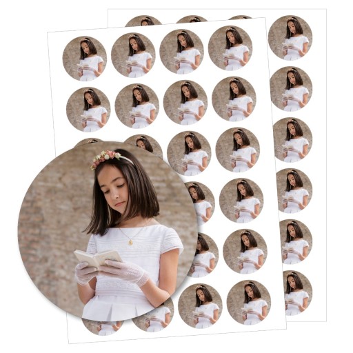 Okrągłe fotonaklejki to oryginalny sposób na spersonalizowanie podziękowań dla gości na komunię i inne kazje.