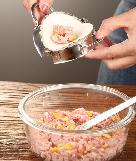 Najpierw za pomocą zestawu do robienia pierogów zrobić owijkę do pierogów (użyć okrągłych foremek) lub ruchomej wycinarki z uchwytem, a następnie umieścić owijkę na składanej formie do pierogów. Nałożyć na to trochę nadzienia na ciasto używając szpatuły, zwilżyć brzegi owijki wodą. Na koniec złóż i dociśnij, aby idealnie zakleić pieróg Dzięki temu łatwo i szybko można zrobić dużą ilość pierogów.