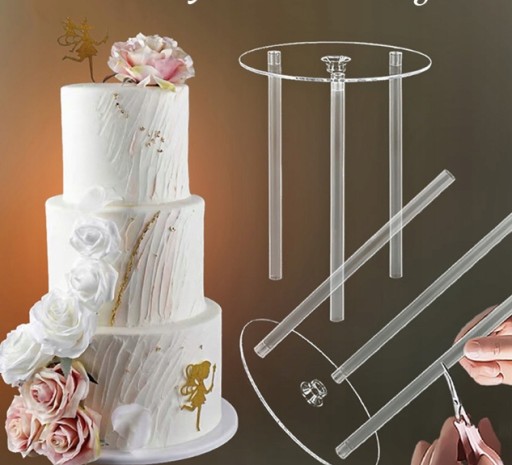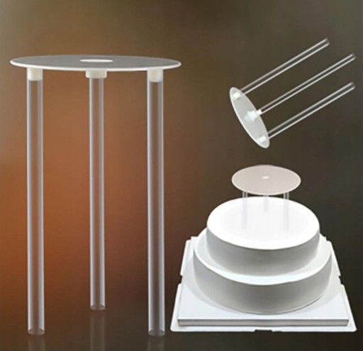 Mocna, bezbarwna podstawka z tworzywa wraz z zestawem 3 wsporników do tworzenia tortów wielowarstwowych.
