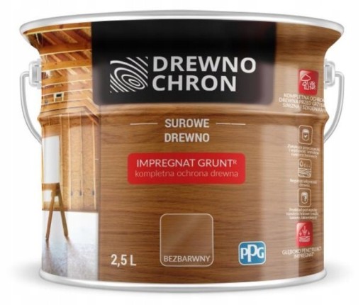 - Celem uzyskania zabezpieczenia biologicznego drewna należy nanieść 2 warstwy Drewnochron Impregnat Grunt głęboko-penetrujący (bezbarwny).