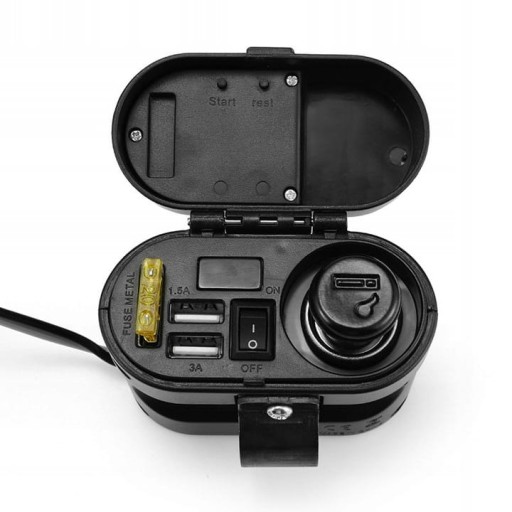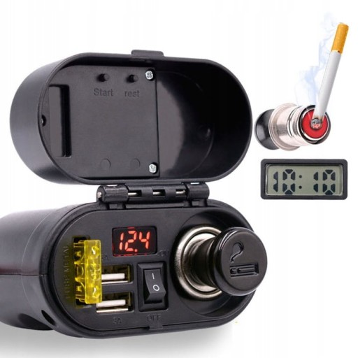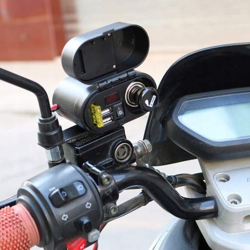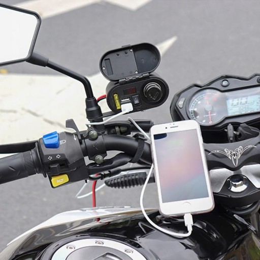 Wodoodporne gniazdo zapalniczki do motocykla, skutera, quada. Wyposażony w woltomierz pokazujący napięcie ładowania akumulatora. Dodatkowo dwa mocne porty USB 5V 3.1A oraz zegarek.