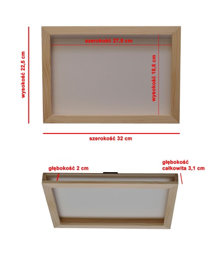 - Rozmiary zewnętrzne ramki wysokość 22,5 cm szerokość 32 cm głębokość całkowita 3,1 cm