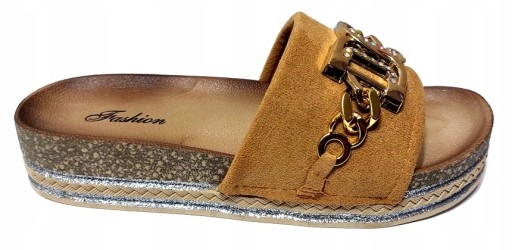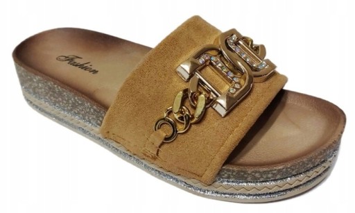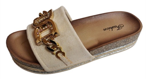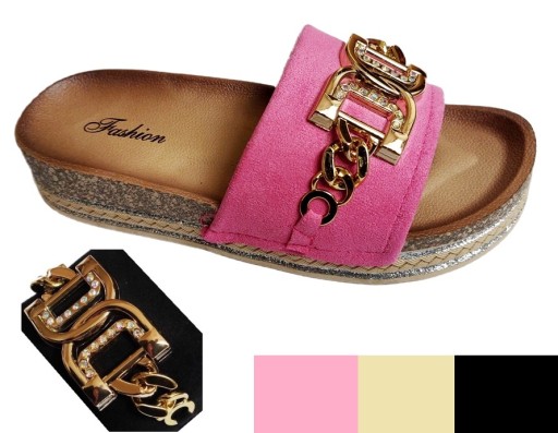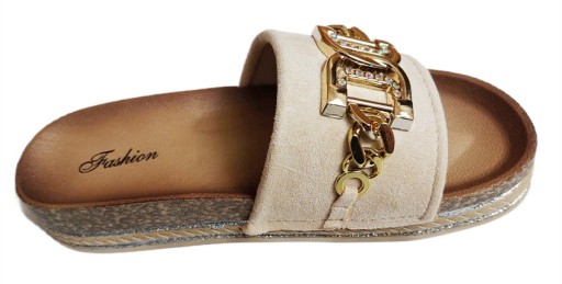 ✅ Klapki zdobione złotym łańcuszkiem z cyrkoniami.