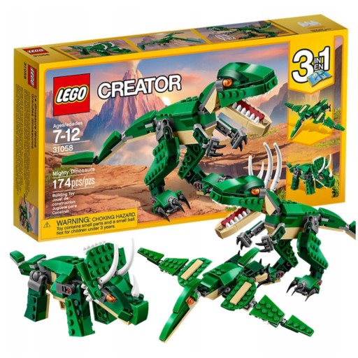 Ten zestaw da Ci mnóstwo świetnej zabawy! Znajdziesz w nim T-Rexa z ruchomymi łapami i głową, wielkimi szponami oraz otwierającą się paszczą uzbrojoną w spiczaste zęby. Dinozaur jest koloru ciemnej zieleni i beżu i ma jasnopomarańczowe oczy. W zestawie znajdziesz też resztki ofiary dinozaura w postaci klatki piersiowej do złożenia. LEGO Creator Potężne dinozaury to zestaw typu „3 w 1”: model można przerobić na triceratopsa lub pterodaktyla.