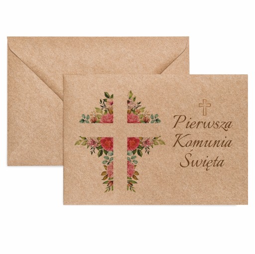 Piękny Kraftowy wygląd koperty urozmaicony o komunijny nadruk to idealne urozmaicenie podarunku lub zaproszenia.