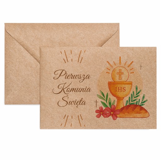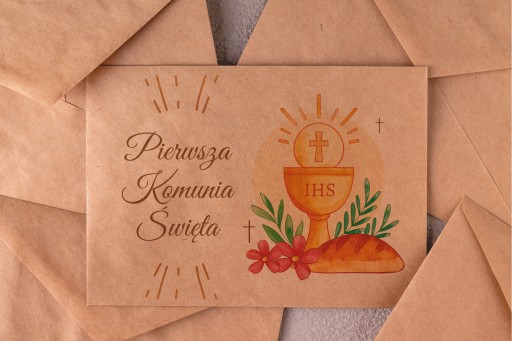 Piękny Kraftowy wygląd koperty urozmaicony o komunijny nadruk to idealne urozmaicenie podarunku lub zaproszenia.