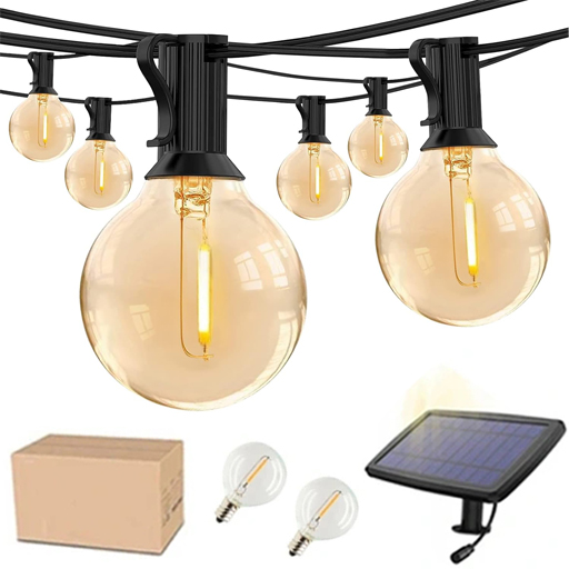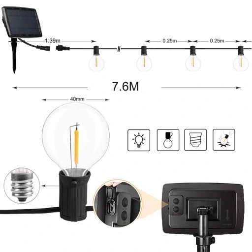 Solarna lampa łańcuchowa zewnętrzna G40 ma 7,6 m długości, 25 sztuk żarówek kulowych.Światła zasilane są energią słoneczną.Żarówki LED o wysokiej wydajności oszczędzają ponad 90% energii w porównaniu z żarówkami.Słoneczne zewnętrzne oświetlenie łańcuchowe automatycznie włącza się w nocy i wyłącza w ciągu dnia.Ładowanie USB może być uzupełnieniem, gdy w ciągu dnia nie ma wystarczającej ilości światła słonecznego.